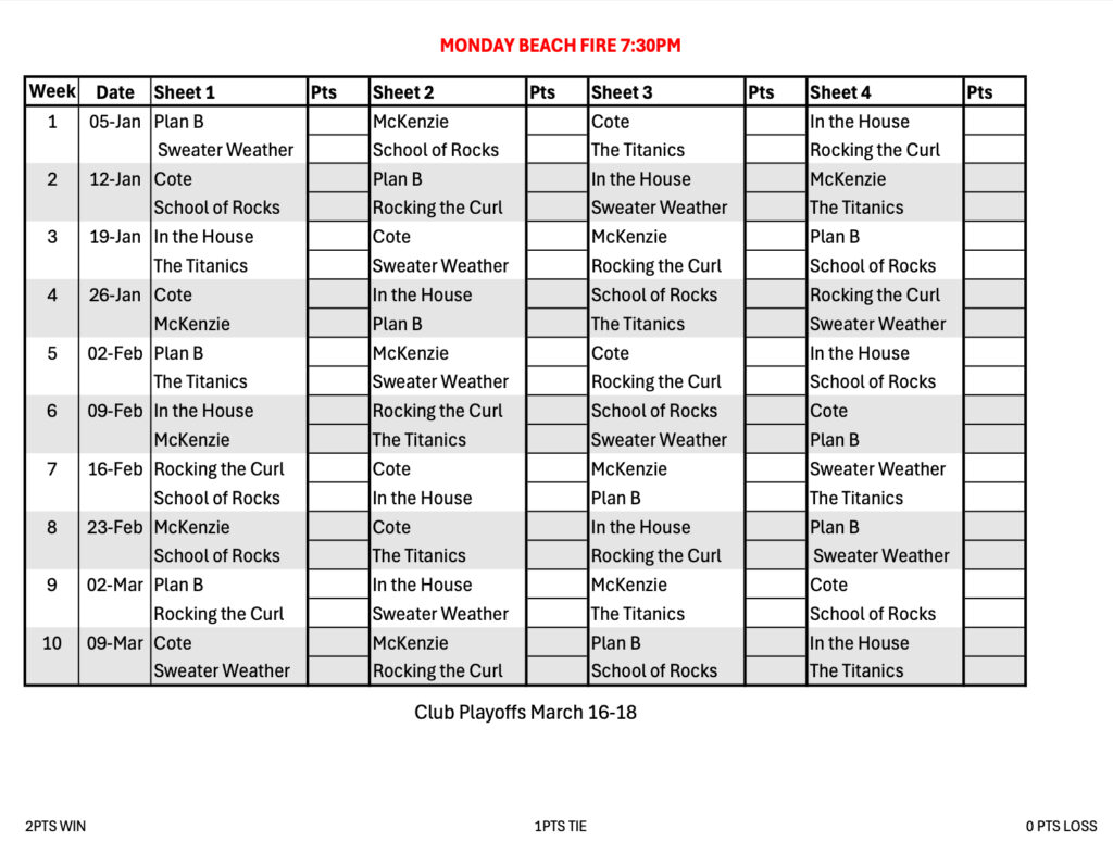 This Monday night open league is sponsored by Beach Fire Brewing Company. The Monday Beach Fire League is fabulous for new curlers looking to try curling and meet new people , and for Novice curlers learning how to skip a team. Young and old friends, family, co-workers, couples, and new curlers are all welcome.