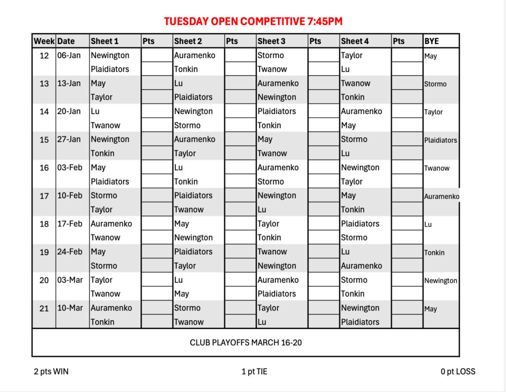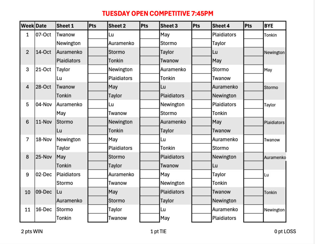 The Tuesday Open Competitive League is a league for more experienced curlers. The Open format means any combination of 4 players are welcome.